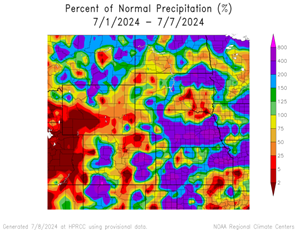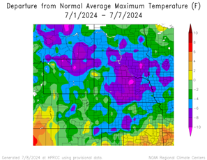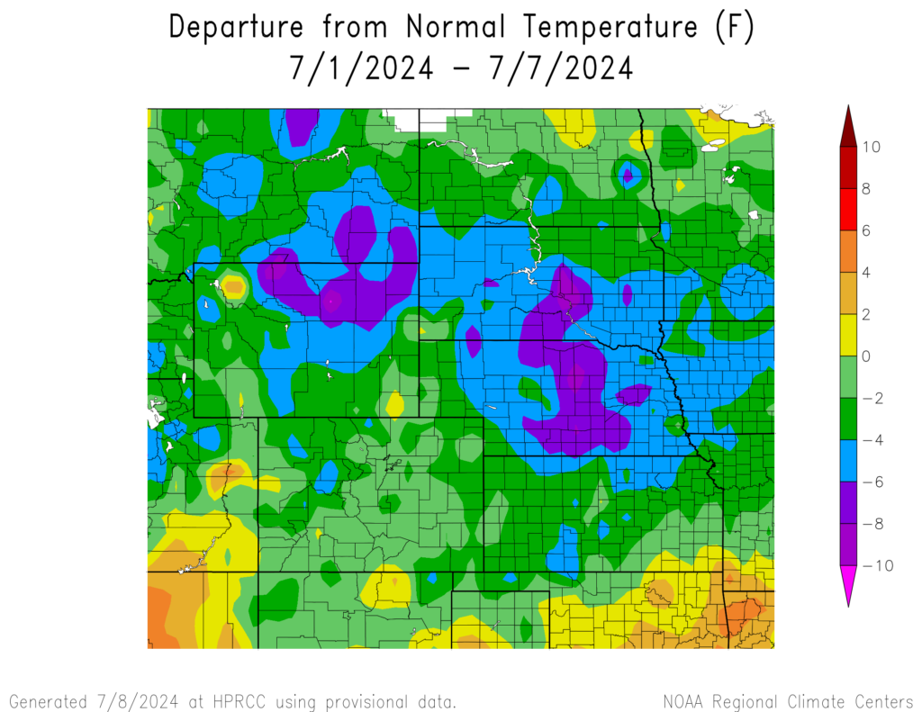This week featured below normal temperatures for the majority of the region. The coldest regions were northern Wyoming, central South Dakota, and central Nebraska with temperatures 6°F to 8°F below normal with some spots reaching 8°F to 10°F below normal. The warmest region was the northwestern corner of Wyoming reaching 2°F to 4°F above normal.